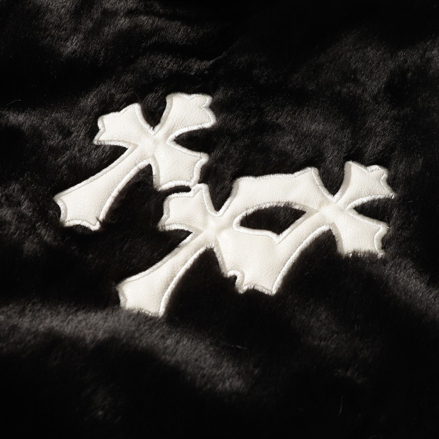 Chrome-Hearts Faux Fur Cross Varsity Jacket - Black White Gothic Streetwear 035