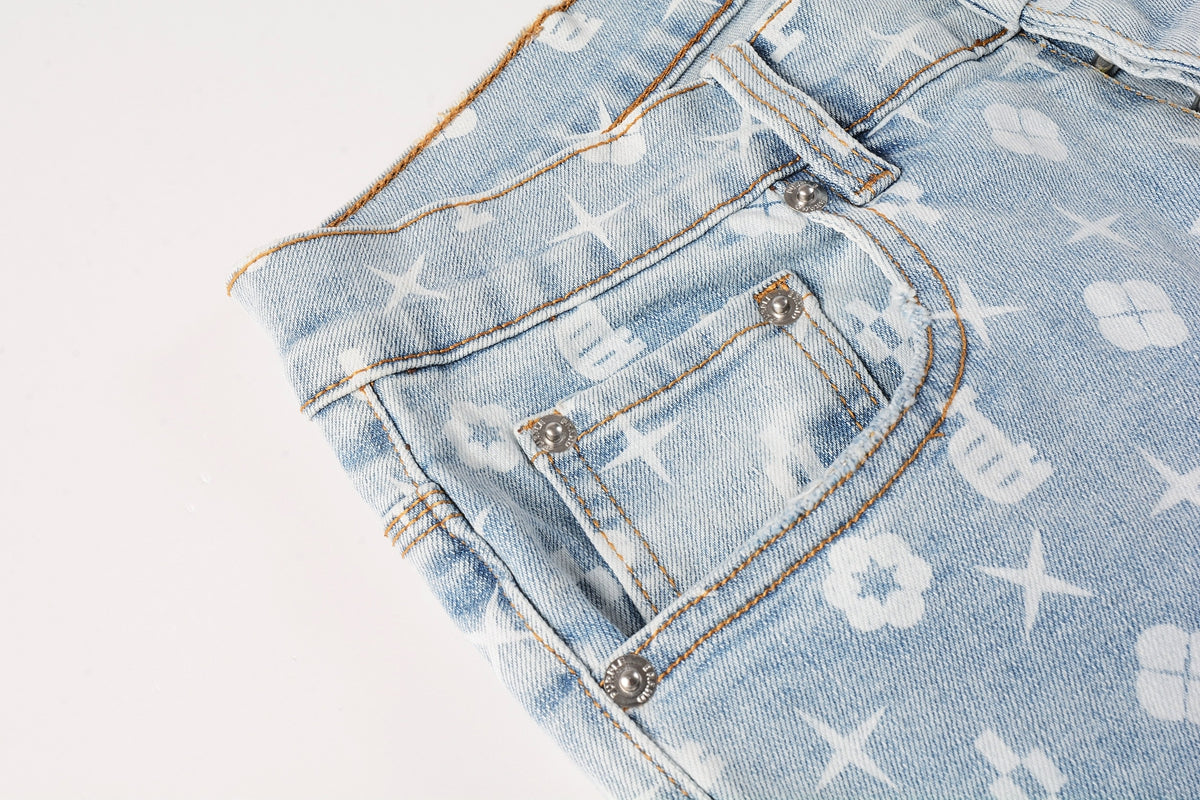 PURPLE Men Streetwear Skinny Jeans Light Blue Wash with All - Over Pattern Print 9089