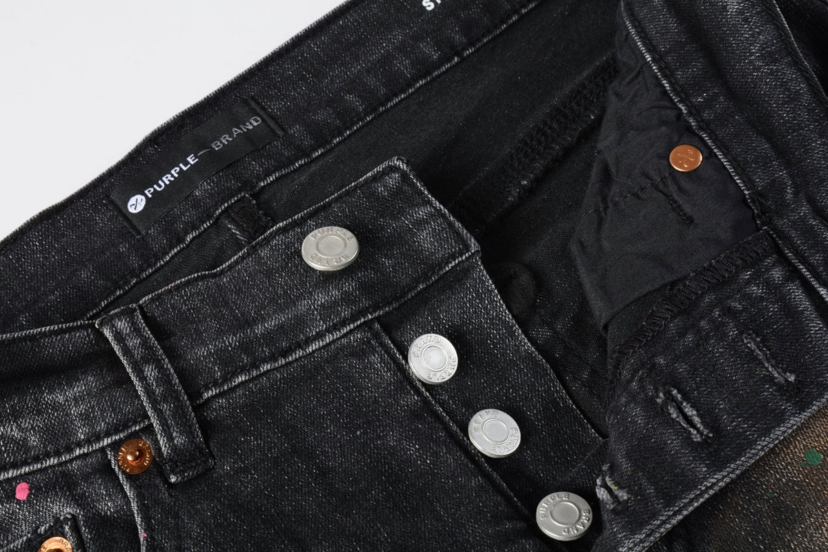 PURPLE Men’s Black Skinny Jeans with Rust-Toned Wash and Multicolor Paint Splatter Artistic Distressed Street 9109