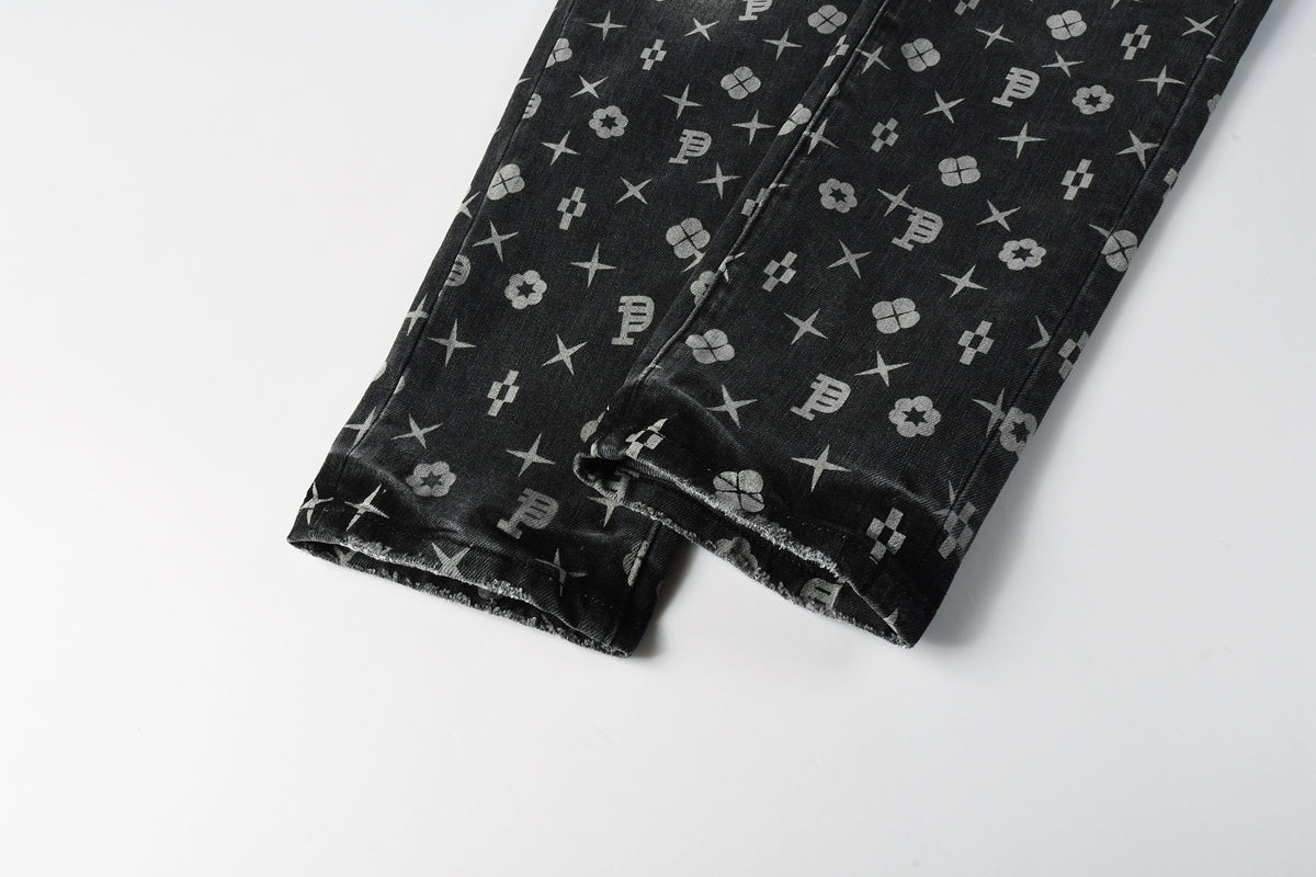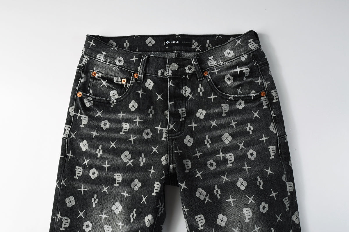 PURPLE Men Classic Street Skinny Jeans Dark Grey Monogram Print All Over Distressed Style 9112